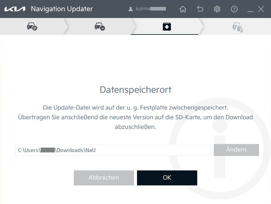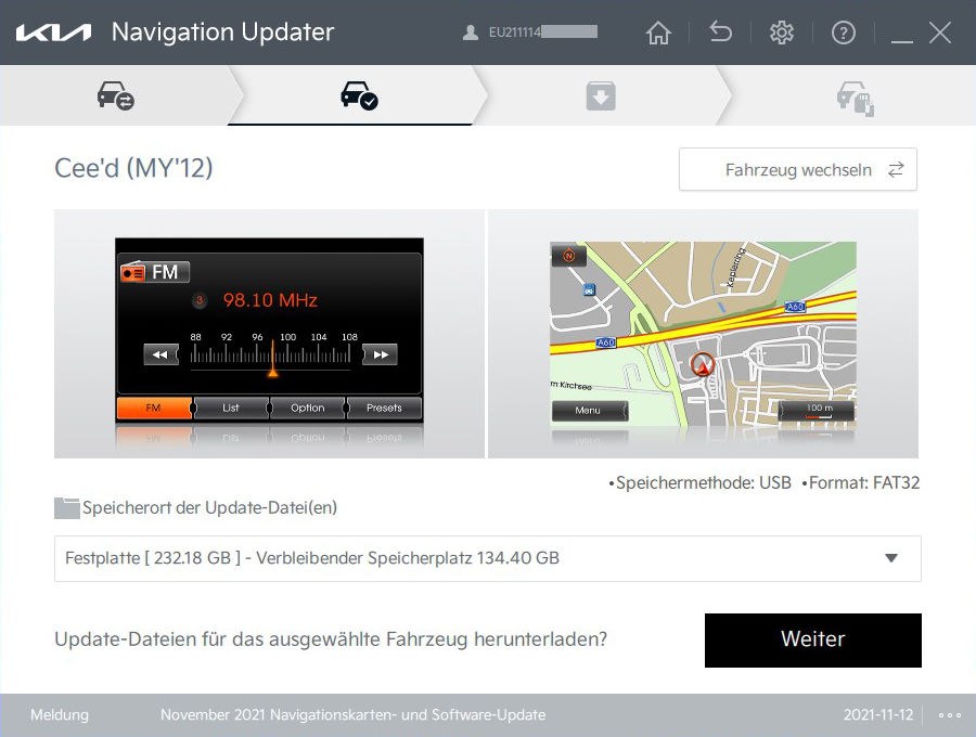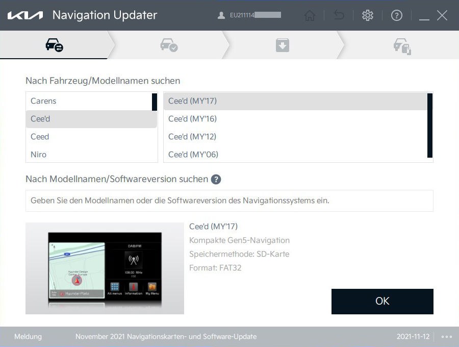 Hat man den Speicherort für die Navi-Update-Downloads angegeben (kann im nachhinein über die Einstellungen [Zahnrad] geändert werden) und mit OK bestätigt, kommt man zur Fahrzeugauswahl und der entsprechenden Navi-Generation mit dem passendem Hinweis des Speichermediums.