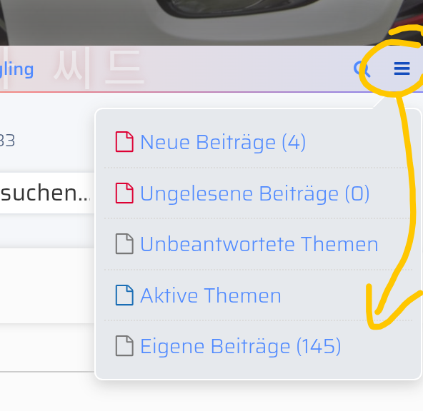 Eine Übersicht über deine eigenen Beiträgen, kannst du über das kleine Menü neben dem Suchsymbol einsehen.