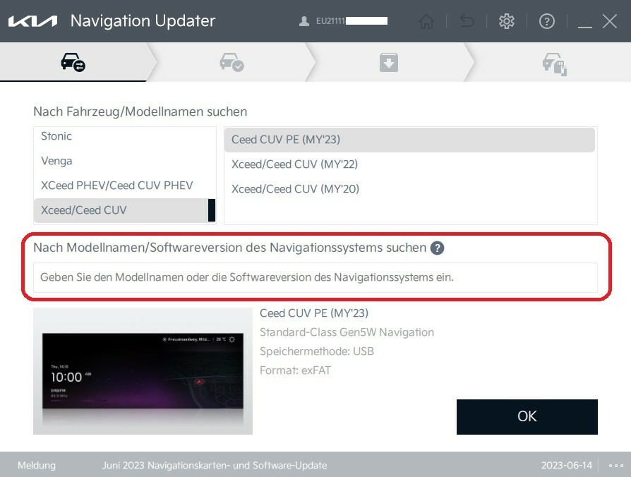 Um sicher zu gehen das du auch das richtige Update runterlädst, kannst du im Update-Programm aus deinem Navi-Gerät die aktuelle Version oder die Modellbezeichnung eingeben (siehe rote Markierung im Bild).