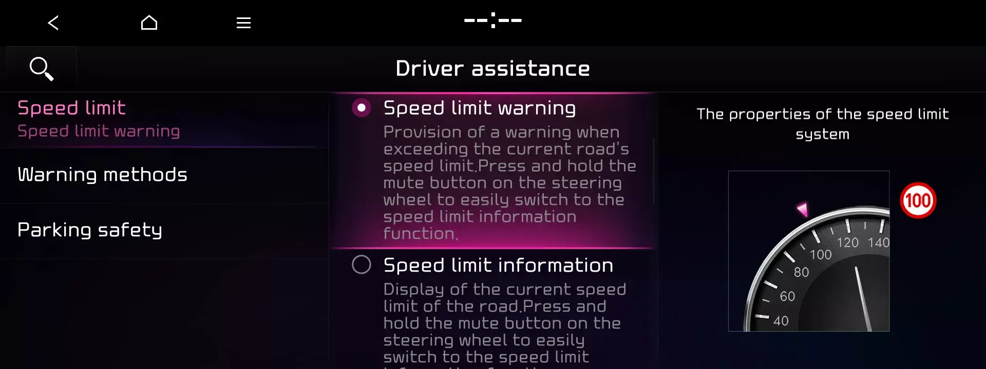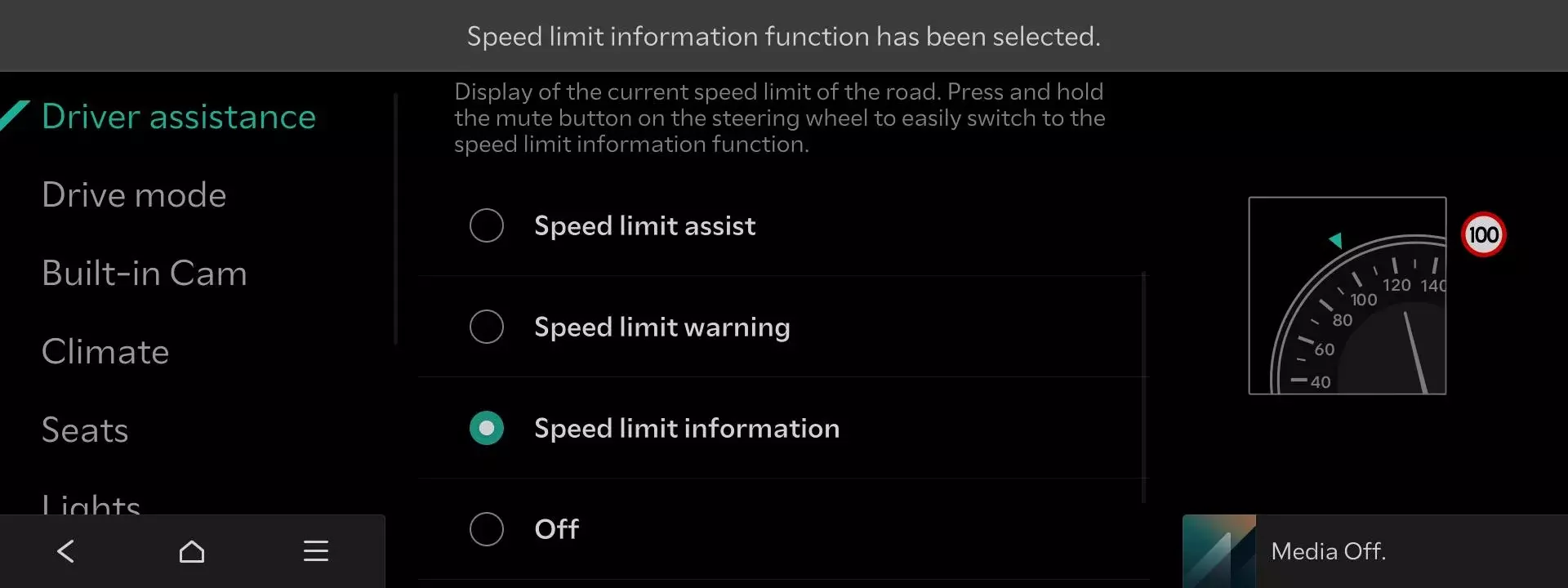 Sie können die Tempolimitwarnungen jetzt jederzeit deaktivieren.- Um die Tempolimitwarnungen zu deaktivieren, halten Sie einfach die Stumm-Taste am Lenkrad gedrückt. Dies ändert die Einstellung zu [Tempolimitinformationen], die keine akustischen Warnungen ausgibt.